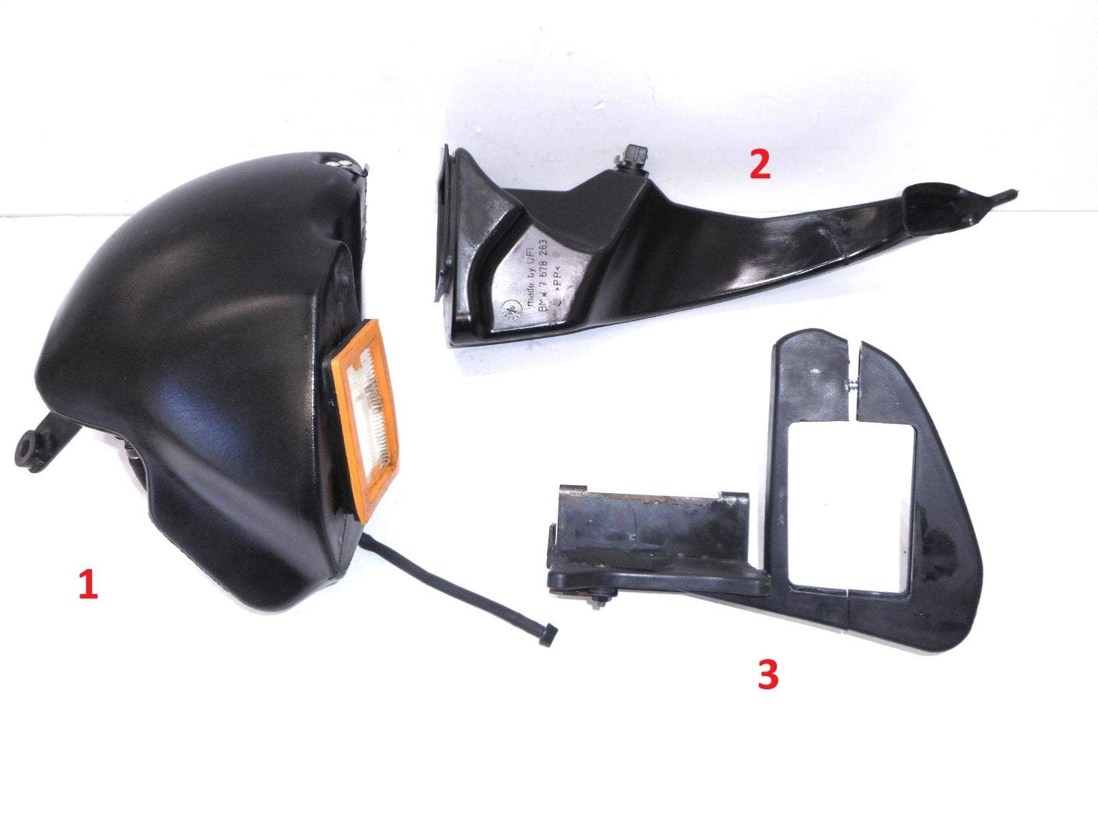 Cena je za držák baterie a sací potrubí (č. 3). Tělo Airboxu (č. 1) je za 420, Kč a sací potrubí (č. 2) stojí 350, Kč. Díl pochází z motocyklu BMW F 650 GS. r. 2005 (facelift). Při použití na jíný model ověřte před objednáním kompatibilitu. Ilustrační foto v popisku.